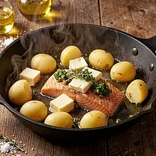 Store the gremolata in an airtight container in the fridge for a maximum of 24 hours. Baked salmon tastes best on the same day; store leftovers in the fridge for up to 48 hours, reheating briefly in the oven at 120–140°C (8–10 minutes) or in a pan over low heat, avoiding drying out. Store the potatoes separately, and it's best to reheat them in a pan to regain their crispiness.