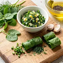 Delicate salmon baked in the oven under a fresh, spring gremolata of sorrel and dill, served with young potatoes prepared in the traditional Masurian way (briefly steamed and sautéed/browned). The dish combines the rich, buttery texture of the fish with the sharp, lemony freshness of the gremolata. Sorrel adds a tanginess reminiscent of lemon, dill brings the aroma of meadows and lakes, while the young potatoes provide a rustic counterpoint. This dish is perfect as a light, spring lunch or a dish for a family gathering, pairing well with a seasonal cucumber and dill salad or grilled asparagus.