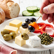 Serve the skewers on a large, flat platter with additional bowls: one with capers, the other with thinly sliced cured ham. Make sure the skewers are at room temperature, as chilled cheese loses its aroma. Pair with a light sparkling drink or low-acidity white wine.