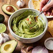 Prepare the guacamole. Cut the avocado in half, twist the halves, and remove the pit. Scoop the flesh into a bowl with a spoon. Mash the flesh with a fork into a cream with small chunks remaining (if you prefer it smooth, mash it more thoroughly). Add 1 small clove of garlic (about 5 g, finely chopped or pressed), 1 teaspoon of lime juice (about 5–10 g), 1/2 pinch of salt (0.5 g), and finely chopped half an onion (about 75 g). Mix and check the taste — add more lime juice or salt to your preference.