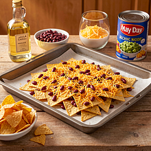 Preheat the oven to 200°C (top-bottom) or 180°C (with fan). Line a baking sheet with parchment paper. Spread the tortilla chips on the baking sheet in a single layer, slightly overlapping to create a "bed" (do not pack too tightly). Drizzle lightly with canola oil (1–2 teaspoons for the whole) to make the chips crispier and prevent them from drying out during baking. Evenly scatter the drained red beans over the chips, then sprinkle with grated cheddar (distribute the cheese so it covers the top but does not hide all the chips). If using canned corn, add it now evenly.