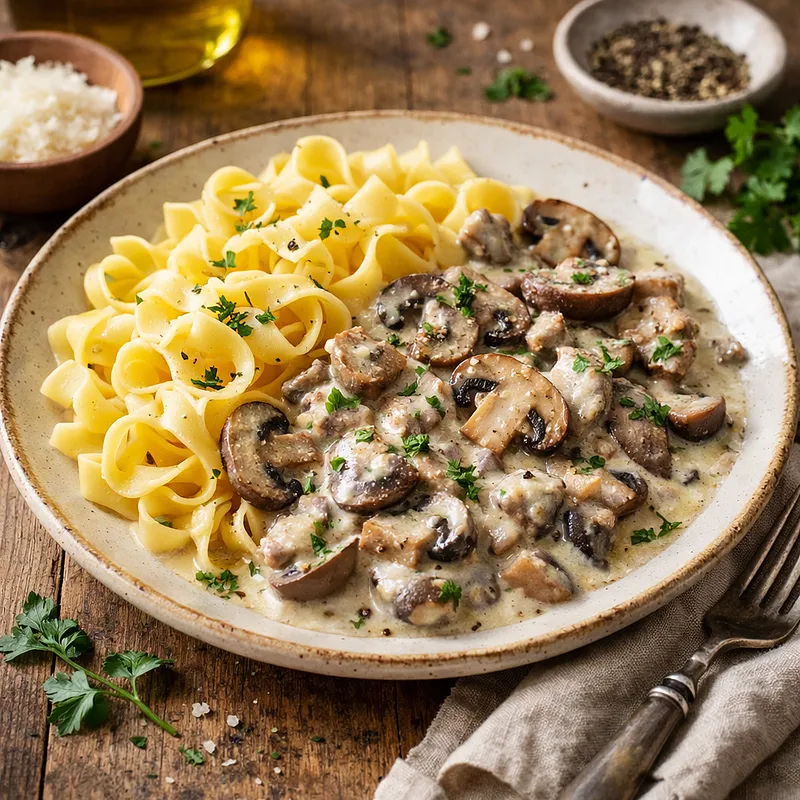 Creamy egg pasta with an aromatic mushroom sauce enriched with cream, onion, and herbs. A dish inspired by Polish tradition of using mushrooms in the kitchen, highlighted by the delicacy of cream and fresh parsley. It works well as a hearty lunch or a Sunday main course. Rich in flavor, slightly earthy due to the mushrooms, smooth thanks to the cream and buttery base. Serve with grated yellow cheese or parsley, alongside white wine or apple compote.