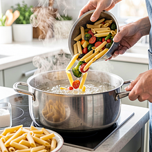 In a pot with a capacity of at least 3 liters, bring 2.5 liters of water to a boil (the water should freely cover the pasta and have room for bubbling). Add about 10 g of salt to the boiling water (a large spoon) — you can adjust the salt according to our recipe. Add 400 g of penne pasta and cook according to the package instructions minus 1 minute (usually 8–10 minutes) — we are aiming for al dente. Drain the pasta in a colander, reserving 100–150 ml of the cooking water.