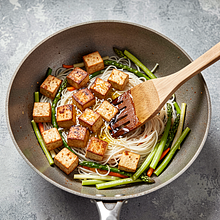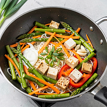 Aromatic, light dish inspired by Asian cuisine, adapted to Polish spring: crunchy asparagus and young carrots combine with delicate tofu and rice noodles. The sauce made from soy sauce, fresh ginger, and lime juice adds acidity and freshness. It's a quick, colorful lunch or dinner, perfect for days when we want to eat vegetable-rich and filling meals. Serve with toasted sesame seeds and optional chili sauce for heat; it pairs well with a young cabbage salad or pickles. Visually, the dish attracts with the green of the asparagus, the orange of the carrots, and the red of the bell pepper.