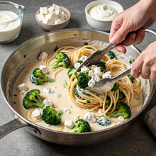 Creamy pasta with broccoli and feta cheese is a modern interpretation of a simple homemade dish, combining a Polish seasonal vegetable with a bold cheese. The dish comes together quickly — in about 30 minutes — and achieves a creamy consistency thanks to the cream, along with delicate, slightly tangy notes from the lemon and feta. Perfect as a hearty lunch or a light dinner; it pairs well with young salad, sourdough bread, or as part of a larger menu. Visually, the dish features a contrast of the green broccoli and white feta, along with golden accents from the sautéed pasta, making it look appetizing on the plate.