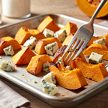 In a bowl, mix the chopped pumpkin with 15 g of rapeseed oil and 1 g of salt. Spread the pieces on a baking sheet lined with parchment paper in a single layer, not crowded.