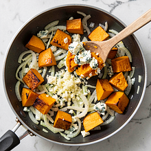 Add crushed garlic (15 g, pressed or finely chopped) and sauté for 30-40 seconds until you feel the aroma — do not let the garlic brown, as it will become bitter. Add the roasted pumpkin (remove it from the oven and transfer it to the pan). You can lightly mash 3-4 pieces of pumpkin with a spoon to give the sauce a creamy texture with pieces of pumpkin.