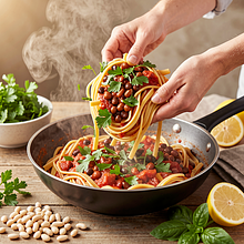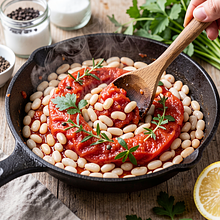 A delicate, spring dish that combines the simplicity of plant-based cooking with the velvety texture of white beans and the aroma of fresh herbs. This quick main course was created with everyday meals in mind — hearty thanks to the plant protein from the beans, yet light due to the lemon and fresh parsley. Inspired by Polish simplicity: beans as a protein base, fresh herbs, and seasonal tomatoes give the dish juiciness and color. Serve with a salad of young leaves or as a standalone dish. Perfect for spring lunches when you want something quick, healthy, and full of herbs.