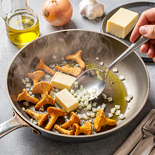 In a large skillet, heat canola oil over medium heat. Add the chopped onion and sauté for 3-4 minutes until it becomes translucent and soft. Add the minced garlic and sauté for another 30 seconds until fragrant (be careful not to let it brown). Push the onion to the side of the skillet, add butter, and when it melts, increase the heat to medium-high and add the chanterelles. Sauté the chanterelles for 5-8 minutes, stirring every 30-40 seconds — they should release liquid and then lightly brown. If too much liquid appears, sauté longer uncovered until it evaporates and the chanterelles are golden.