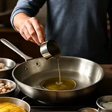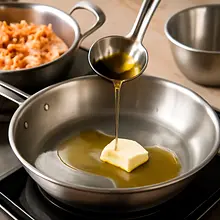Heat a large skillet (28-30 cm in diameter) over medium-high heat. Add 15 g of olive oil (1 tablespoon) and half of the butter (15 g). When the butter stops foaming and begins to lightly bubble (about 30-60 seconds), add the drained seafood mixture in a single layer. Cook without stirring for 1-2 minutes, until the bottom is lightly browned, then stir and cook for another 1-2 minutes — the seafood should become firm and opaque (pink shrimp, squid rings). Remove the seafood to a plate and set aside — do not allow it to cook for too long, as it will become tough.