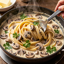 Creamy pasta with mushrooms and cream is a simple yet elegant dish from Polish cuisine — perfect for a quick weekday lunch or an informal gathering with friends. Sautéed mushrooms with a delicate sweetness of onions combine with cream, butter, and a touch of lemon juice, creating a velvety sauce that envelops the pasta. The dish has a pleasant light brown color, creamy texture, and intense mushroom aroma. Serve with parsley or grated yellow cheese as an option; it pairs wonderfully with a light salad of seasonal vegetables and fresh bread.