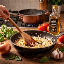 When the pasta is almost ready (al dente), drain it, reserving about 150 ml of the cooking water. Do not rinse with cold water. Place the pasta in a large bowl or directly into the pan with the sauce (if the pan is large enough).