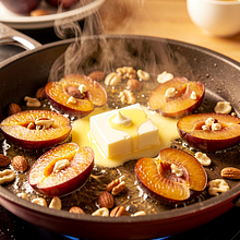 In a large, wide skillet, heat 25 g of butter over medium heat. When the butter melts and starts to foam slightly (about 30–45 seconds), evenly sprinkle the chopped plums onto the skillet.