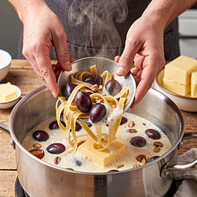 A sweet dish reminiscent of homemade desserts from childhood: cooked pasta drizzled with butter and warm, caramelized plums topped with crunchy nuts. This combination of the delicate texture of pasta, the sweetness of the fruit, and the slightly bitter nut creates a harmonious contrast of flavors. The dish has roots in Polish home cooking, where simple ingredients were combined into hearty, sweet meals. Serve slightly warm as a dessert after dinner, at a family gathering, or as a sweet breakfast on the weekend. It looks impressive thanks to the shine of the caramelized plums and the sprinkle of broken nuts; the flavor is complemented by a touch of cinnamon and lemon zest.