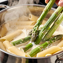 3 minutes before the pasta is done cooking, add the chopped asparagus (tips and pieces) to the same pot. Blanch together with the pasta for 2-3 minutes — the tips should be tender, and the stems soft but not mushy. After cooking, drain the pasta and asparagus together, reserving the previously drained water.