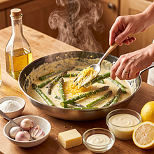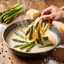 Delicate pasta with seasonal asparagus in a creamy, slightly tangy lemon sauce. The dish combines the freshness of green asparagus and lemon zest with the velvetiness of cream and the nutty note of Parmesan and optional walnuts. It is a modern take on Polish spring cuisine — quick, aromatic, and impressive. Serve with extra lemon zest and chopped parsley; it pairs wonderfully with a light white wine or cool water with a slice of lemon. The dish has a pleasant texture: al dente pasta, firm asparagus, and a smooth sauce, while visually — vibrant green and creamy sauce sprinkled with grated Parmesan.