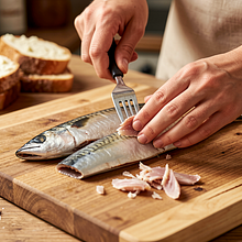 Check the mackerel fillets: place them on a board and check for any large bones. Using a fork and knife, separate the flesh from the skin and remove any visible bones. Then transfer the separated flesh to a bowl. This process should take about 3-4 minutes. If you prefer a very smooth paste, use an immersion blender.