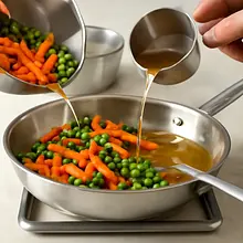 Add the blanched carrots and drained peas to the pan. Pour in the vegetable broth (100 ml) and gently stir with a wooden spoon to combine the ingredients. Bring to a light boil, then reduce the heat and cook together for 2-3 minutes, until the broth partially evaporates and the flavors meld.