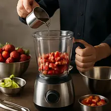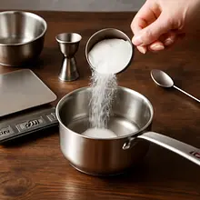 Prepare a simple 1:1 syrup. Measure 80 g of sugar and 80 ml of water. In a small saucepan, combine the sugar and water, heating over medium heat, stirring with a wooden spoon until the sugar completely dissolves. When the mixture starts to gently boil, reduce the heat and cook for 1 minute uncovered. Remove from heat and let it cool (about 10–15 minutes). Once cooled, the syrup will be clear and slightly sticky. Measure out 80 ml of the resulting syrup for later use.