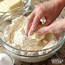 Prepare the ingredients; take the butter out 10–15 minutes in advance, it should be cool but not hard (it should be easy to cut). Sift the flour into a large bowl, add the powdered sugar, vanilla sugar, and salt. Cut the butter into cubes of about 2 cm and distribute evenly over the flour.