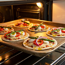 Store the baked mini pizzas in the refrigerator for up to 24 hours in an airtight container. To reheat: place in an oven preheated to 200°C for 3–5 minutes or on a skillet with a lid for 2–3 minutes to restore the crispness of the crusts. I do not recommend using a microwave — it will make them soft.
