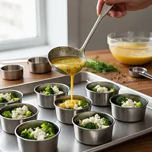 Przygotowaną masę jajeczną delikatnie wlej do każdej foremki, wypełniając je niemal po brzegi. Masa lekko urośnie podczas pieczenia. Jeśli używasz składników opcjonalnych, teraz jest moment, aby posypać wierzch startym Parmezanem, co stworzy apetyczną, chrupiącą skórkę.