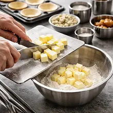 Prepare the ingredients and tools: a glass, kitchen scale, knife, cutting board, large bowl, grater (optional), rolling pin, plastic wrap, and a mini tartlet mold (diameter 8-10 cm). Weigh 300 g of flour and sift it into a large, cool bowl. Add 40 g of powdered sugar and 3 g of salt, and mix with a wooden spoon to combine the dry ingredients.