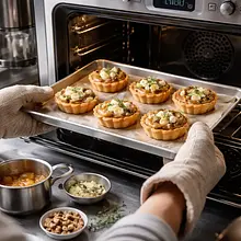 Traditional, seasonal mini tarts combining delicate shortcrust pastry with the sweetness of caramelized pear, a creamy-salty touch of gorgonzola, and crunchy walnuts. A perfect dish for autumn-winter gatherings — impressive, aromatic, and easy to serve as a warm appetizer or at room temperature. It looks very decorative thanks to the golden slices of pear, a drizzle of honey, and sprigs of fresh thyme. Recommended to be served with a white, slightly sweet wine or cider; it also works well as a snack on cocktail tables. Flavor qualities: a sweet-caramel contrast with a distinct, slightly spicy note of blue cheese and a nutty texture.