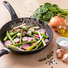 In a pan, heat 15 g of rapeseed oil over medium heat. Add the white parts of the spring onion and sauté for 2–3 minutes until soft and slightly golden. Add finely chopped garlic (10 g) and sauté for 30 seconds. Add the chopped asparagus and radish, and cook for 3–4 minutes until slightly softened but still crisp. Finally, add the spinach and sauté for 1 minute until wilted. Season with 1 teaspoon of thyme (2 teaspoons = 4 g), 2 g of pepper, and salt to taste.