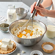 Prepare the cheese mixture: in a bowl, crumble the feta cheese (200 g) with a fork into small pieces. Add 2 eggs (120 g from the total amount), 100 ml of cream, and mix thoroughly until smooth. Season with freshly ground pepper and a pinch of salt only if the feta is not very salty. The mixture should be silky and slightly runny — if too thick, add 1–2 tablespoons of cream.