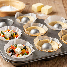 Pre-bake the crusts: line the crusts with parchment paper and fill the paper with ceramic balls, dry beans, or rice as a weight. Bake for 10–12 minutes until the edges are lightly golden. Remove from the oven, carefully take out the weight and paper — the crusts should be dry in the middle and slightly golden.