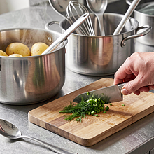 While the potatoes are cooking, prepare the sauce: finely chop the dill on a cutting board with a sharp knife (remove the thicker stems). In a small saucepan, melt 30 g of butter over low heat. Add the cream (100 ml) and gently heat for 2–3 minutes until the sauce thickens slightly — do not bring to a boil. Add half of the chopped dill and season with 1 pinch of salt and 1 pinch of black pepper. If you are using horseradish, grate it on a fine grater and mix it into the sauce (30 g) — this will add some heat.