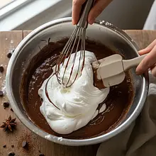 Add 1/3 of the whipped egg whites to the chocolate mixture and mix quite vigorously to loosen it. Then add the remaining egg whites in two batches, this time very gently folding them into the batter using a large silicone spatula. Make movements from the bottom to the top, scooping the batter from the bottom of the bowl and folding it over the top while rotating the bowl. Mix only until the ingredients are combined.