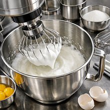 Beat 168 g of egg whites (whites from 4 eggs) until stiff peaks form: start with low mixer speed, then increase the power. Add two tablespoons of sugar (optional — about 30 g) towards the end of beating to make the meringue shiny and stable. The meringue should form stiff peaks that do not fall when the bowl is turned upside down.