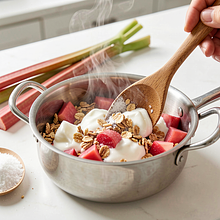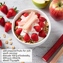 A light, fresh breakfast option that combines crunchy muesli with creamy natural yogurt and seasonal fruits — strawberries and rhubarb. The dish is inspired by Polish spring: rhubarb adds a pleasant tartness, strawberries bring sweetness and color, while the apple provides a delicate texture. Muesli with yogurt is a quick, nutritious breakfast that can be served in bowls or layered in glasses; it pairs well with coffee or green tea. This dish is visually appealing — the contrast of the white yogurt, pink strawberries, and red rhubarb against the brown muesli — and nutritionally valuable: protein from yogurt, fiber from fruits, and carbohydrates from muesli. A simple recipe for beginners, with clear steps for preparing the rhubarb and assembling the portions.