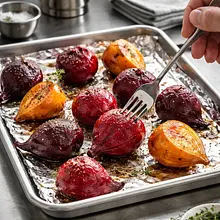 Roast the beets for 20–30 minutes (time depends on size). After 20 minutes, check for tenderness by inserting a small knife or fork: it should go in smoothly without resistance. Once roasted, remove from the oven and let sit for 5–10 minutes to cool slightly so they can be handled.