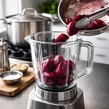 In the blender, add the peeled, slightly cooled beets (if you baked them in foil, remove the skin with your fingers or a knife), add 400 ml of apple juice (set aside 200 ml from the remaining 600 ml for dilution if needed), grated ginger, lemon juice, honey, and cinnamon. Blend on high speed for 45–90 seconds until the mixture is smooth and uniform. The consistency should be thick, creamy, and intensely pink — if the blender is struggling, gradually add the remaining apple juice 1–2 tablespoons (15–30 ml) at a time until you achieve the desired fluidity.