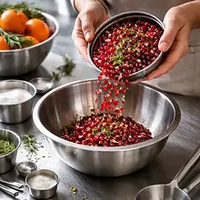 In a medium-sized bowl or jar, add 150 g of pomegranate seeds. Add 6 g of rosemary (crush the needles with your fingers or chop finely with a knife) and, if you want to sweeten, 30 g of agave syrup. Gently mix with a muddler or the end of a wooden spoon for about 60-90 seconds — the goal is to release the juices from the seeds and the aroma of the rosemary, but without crushing the seeds into a pulp.