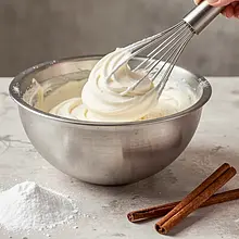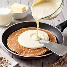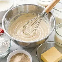 Prepare the ingredients: weigh the flour (200 g) and sift it into a large bowl to aerate. In a separate container, crack the eggs (120 g) and lightly beat them with a fork. Make a well in the flour and pour in half of the milk (200 ml) and the beaten eggs. Mix vigorously with a whisk or a mixer on the lowest speed to slowly incorporate the liquid into the center, creating a smooth, thick batter without lumps. Then add the remaining milk (200 ml), salt (1 g), and half of the sugar (60 g from the total amount), as well as the melted butter (30 g) — mix until you achieve a thin, pouring consistency typical for crepes (the batter should flow freely from the spoon).
