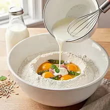 Pour 240 g of eggs (about 4 eggs) and 100 ml of milk into the well. Start mixing with a fork or whisk in the center, slowly incorporating the flour into the liquid mixture until a smooth, thicker batter without dry lumps forms.