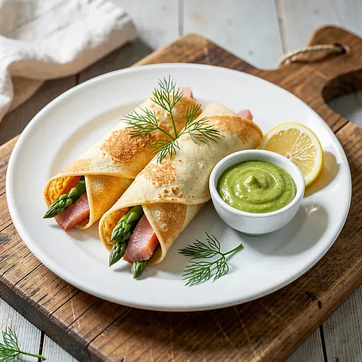 Mazurian variation on a spring lunch: thin pancakes served savory with smoked trout, young green asparagus, and a velvety sorrel cream. The dish combines the smoky flavor of the smoked fish with the distinct, slightly tangy freshness of the sorrel and the delicate crunch of the asparagus. Perfect for a spring breakfast or a light lunch; it pairs well with young potatoes with dill or a simple radish salad. Visually: green accents of sorrel and asparagus and pink slices of trout on golden pancakes.