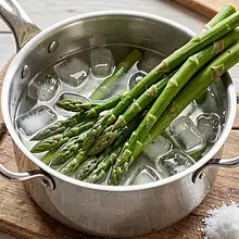 Prepare the asparagus: snap off the woody ends (usually 2–3 cm) by holding one hand at the tip and the other at the bottom; the stem will break naturally at the transition to the woody part. Bring salted water to a boil (about 6 g of salt per 1 l). Add the asparagus and cook for 2–3 minutes for thin ones, 4–5 minutes for thicker ones – they should be tender-crisp (with a visible intense green color and slight resistance when pierced with a knife). Immediately transfer to a bowl of ice-cold water to stop the cooking process.