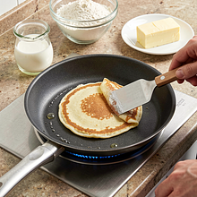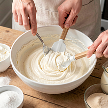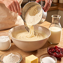 Prepare all the ingredients on the countertop: weigh the flour and pour it into a large bowl. In a small bowl, crack the eggs and lightly beat them with a fork. In a saucepan, heat the milk to a temperature of about 30–35°C (it should be pleasantly warm, not hot). Make a well in the flour and pour half of the warm milk and the beaten eggs into it. Mix with a whisk starting from the center, gradually incorporating the flour with the liquid until a smooth, lump-free mixture forms. Add the remaining milk, melted and cooled butter, a pinch of salt, and 30 g of sugar. Mix until the batter is homogeneous and slightly runny — compare the consistency to 12% cream: it should flow freely from the spoon but not be watery.