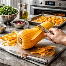 Preheat the oven to 200°C (top and bottom). Wash the pumpkin, peel it thinly with a peeler or a large kitchen knife, and remove the seeds and membranes. Cut the flesh into even cubes about 2–3 cm on each side (even pieces bake evenly). In a large bowl, mix the pumpkin cubes with 20 g of oil and 20 g of honey, as well as 2 g of salt and 1 g of freshly ground pepper – evenly coating each piece.