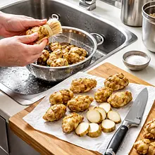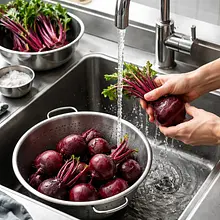 Preheat the oven to 200°C (top-bottom). Wash the beets thoroughly with a brush under running water, trim the roots and tails leaving about 1 cm of the stem (to prevent excessive juice leakage). Dry with a paper towel. Place the beets in a baking dish, drizzle with canola oil and evenly sprinkle with 2 g of salt. Cover the dish tightly with aluminum foil and place it in the oven. Bake for 50–60 minutes depending on the size of the bulbs — check with a wooden stick: it should slide into the beet smoothly without resistance. Once baked, set aside to cool (min. 20 minutes).