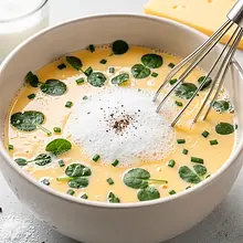 In a large bowl, crack all the eggs, add the milk, and a pinch of salt and pepper. Whisk vigorously with a whisk or fork for 30–45 seconds until the mixture is smooth and slightly frothy. If you are using cheese, add it now and mix briefly.