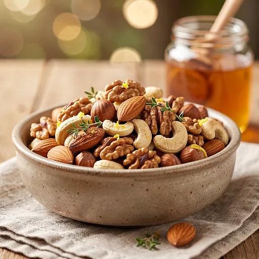 Crispy roasted nut mix with aromatic spices — the perfect snack for a May picnic or garden gathering. The composition combines almonds, walnuts, hazelnuts, and cashews, lightly sautéed in canola oil and seasoned with smoked paprika, thyme, garlic, salt, and freshly ground pepper. The dish has a distinct, slightly smoky character thanks to the smoked paprika; fresh lemon zest can add a spring freshness, while honey provides a delicate, sticky glaze. Serve in bowls or jars — it looks rustic and appetizing, has a pleasant crunch, and an intense aroma of spices.