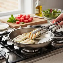 Rozgrzej patelnię grillową lub zwykłą patelnię z grubym dnem na średnio-wysokiej mocy. Gdy patelnia będzie już dobrze rozgrzana, ułóż na niej plastry halloumi. Smaż bez dodatkowego tłuszczu (ser ma go w sobie wystarczająco) przez około 2-3 minuty z każdej strony. Ser jest gotowy, gdy na jego powierzchni pojawią się złoto-brązowe paski (na patelni grillowej) lub złociste plamki, a ser stanie się miękki w środku. Unikaj zbyt długiego smażenia, bo ser stanie się gumowaty.