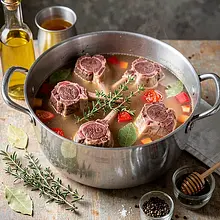 Ossobuco with rhubarb and buckwheat honey is a variation of the classic Italian braised veal shank with a distinct spring accent: the tart-sweet rhubarb and aromatic buckwheat honey. The dish combines a thick, deep vegetable sauce with a hint of honey-rhubarb glaze, while sorrel and parsley add freshness when served. This warming dish is perfect for a cooler spring or winter evening and pairs wonderfully with buckwheat or mashed potatoes. Visually: a dark, glossy sauce enveloping tender meat with a visible bone and scarlet pieces of rhubarb — an effect that is both rustic and elegant.