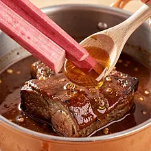 About 15 minutes before the end of cooking, add the chopped rhubarb to the pot around the meat. Gently mix so that the pieces of rhubarb are in the sauce. After 10 minutes, add the buckwheat honey: drizzle it over the pieces of rhubarb and a small amount of sauce, stirring carefully so that the honey dissolves evenly and slightly caramelizes. Cook for another 5 minutes — the rhubarb should soften but retain its shape.